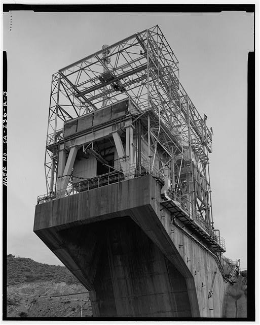 Bldg. 8765 is the substructure of Test Stand 1-A (CA-236-R-1). This massive structure is 70 feet wide and 150 feet high at the northern edge and 50 feet wide and 110 feet high at the southern edge, with an overall length of 203 feet from the northern edge to the southern edge. The entire structure is constructed of reinforced concrete. The top deck of the test stand is level with the road in the test area; thus, the structure is primarily subterranean or cantilevered from the northern ridge face. The overall form of the structure is a two-level rectangle between the northern and southern structural piers and a braced cantilevered deck extending from the northern structural pier. A poured concrete, U-shaped deflector pit descends north from the north structural pier at an approximately 60-degree angle from 45 feet below the topdeck (CA-236-R-4). The top deck has a hole in the northern end measuring approximately 60 feet wide by 40 feet long. The superstructure above the top deck holds the test vehicle above this opening, directing the blast of the rocket down to the flame deflector pit