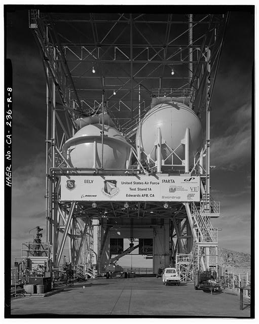 The superstructure that holds the test vehicle, the fuel, and the oxidizer has been modified over the years to meet the needs of new testing programs. The current structure is two rectangular, steel, open frames (CA-236-R-6 through CA-236-R-19). The southern frame is of lighter steel and supports the fuel and oxidizer tanks on top. The northern frame is of heavier steel and supports the test vehicle in the center of the lower third of the structure. There are two levels of work space below the top deck of Test Stand 1-A in the southern 149 feet of the test stand, referred to as Bldg.8783 (CA-236-0-1 through CA-236-0-12). The test stand appears to be in good condition.