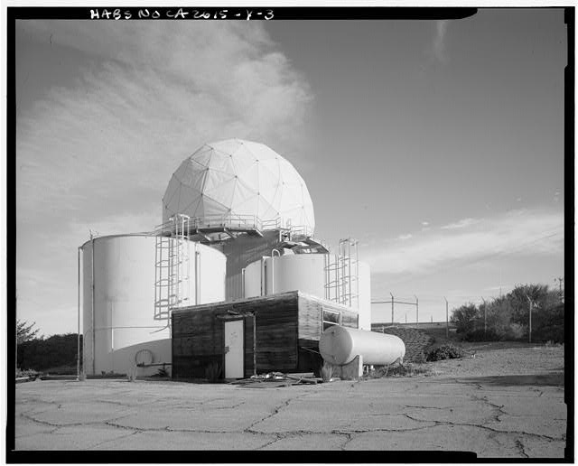 Building 409, Radar Dome (search tower) circa 1951. 35 foot diameter, white, spherical dome on four-level square tower clad in corrugated steel. Rubber and nylon skin on metal frame enclose turning reflector. Original radar equipment replaced about 1982. This is still a working radar and for safety reasons it was not photographed on the interior.